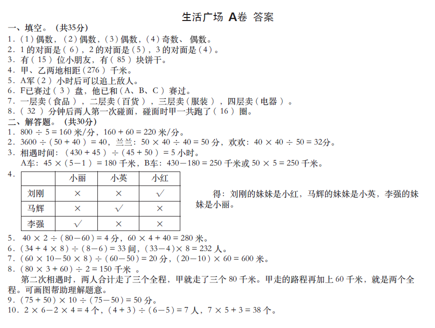 生(shēng)活廣場(chǎng)A卷--四上(shàng)
